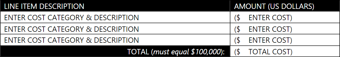While the information provided in the previous section is intended to reveal strategic and practical implementation plans for your proposed solution, we also require other information necessary for our judges to understand the financial needs and feasibility of your proposal. You are required to submit a comprehensive budget and complementary explanations for the $100,000 award.